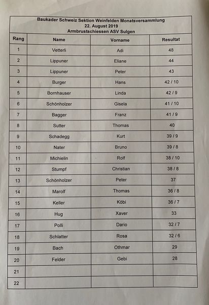 Am Donnerstag 22.08.2019 trafen wir uns bei den Armbrustschützen in Sulgen. Unter der Leitung von Manfred Schweiss und Markus Eugster konnten 20 Mitglieder der Sektion Weinfelden sieben Schüsse mit der Armbrust in Richtung Zielscheibe bringen. Die schlechtesten zwei Schüsse wurden gestrichen und am Schluss konnte Adi Vetterli mit unglaublichen 48 Punkten den Sieger-Preis entgegen nehmen. Nach dem sportlichen Teil durften wir noch einen leckeren Fitnessteller und ein Stück Schwarzwäldertorte geniessen. An dieser Stelle ein grosses Dankeschön der Firma MB Mobilbeton Frauenfeld, Herr Rolf Burgermeister, welche uns das Essen gesponsort hat. Herzlichen Dank auch allen Helfern des ASV Sulgen für den wirklich gelungenen Abend.
